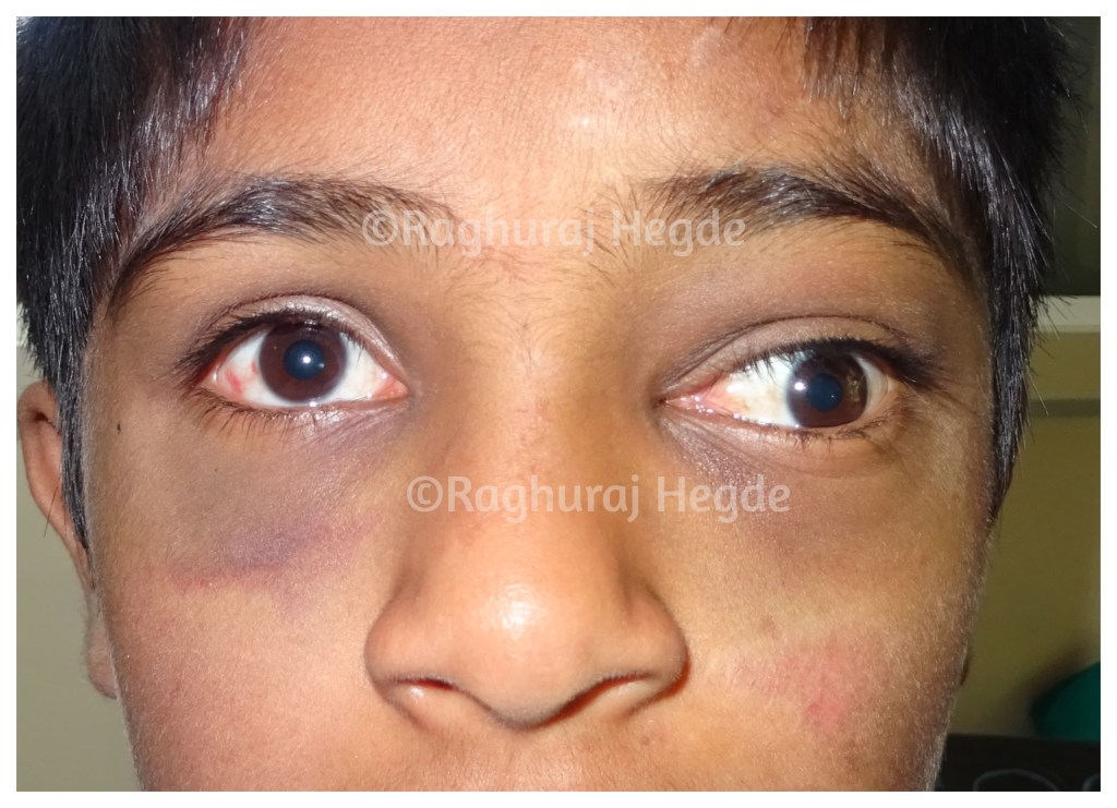While the oedema and ecchymoses reduced, the protrusion of the left eye was increasing slowly with development of diplopia and reduced vision in the left eye. When they went back to the physician, he consoled them that everything will get alright in a few days. However, luckily for the boy, the parents did not buy this reasoning and came to Bangalore to get it seen by an ophthalmologist. They landed up in the hospital I was operating that day. As I came down to the clinic, my colleague told me to see a patient urgently.