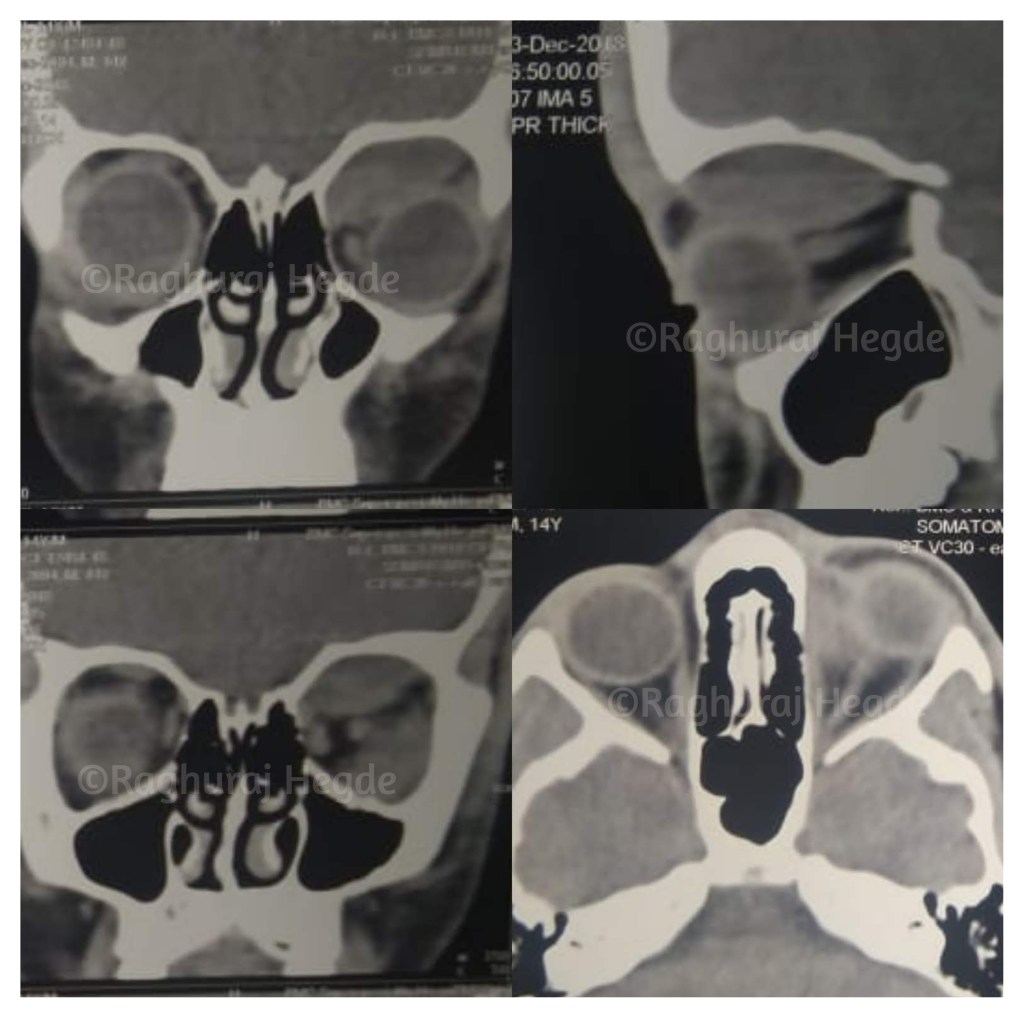 It was a regular day at the clinic for me on a Monday morning. I had just finished my morning surgery list and came down to the clinic to see patients. The first patient on the clinic list was a 10 year old kid who gave a history of hitting a stationary tractor while riding on his cycle about 15 days ago. The tractor’s back had made contact with his forehead. He had fallen unconscious and was taken to a local hospital. There he was examined by an emergency physician, he noted Bilateral ecchymoses and lid oedema (classical Raccoon eyes or Black eye sign of a scalp injury). The physician had ordered a CT scan which did not reveal any facial fracture or intracranial injury. Thus, he was given conservative treatment and discharged.