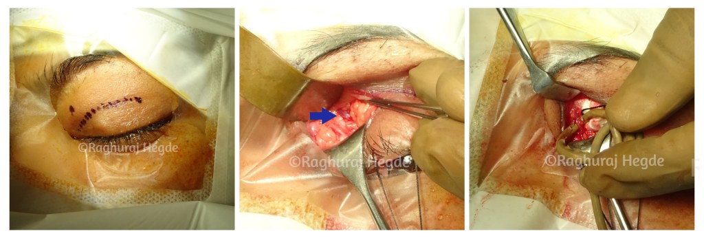 A medial eyelid crease incision. The Orbital Septum is then dissected and incised. Fat prolapses. Blunt dissection of the supero-medial orbital fat is done towards the supra-orbital notch till the arterialised SOV is identified (Blue Arrow). Once identified and dissected, the SOV is looped with a rubber ligature.