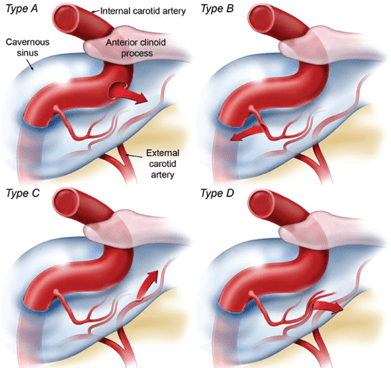 2. Indirect CCFs or Type B,C,D- which are low-flow fistulas between meningeal branches of the internal carotid artery system and the cavernous sinus