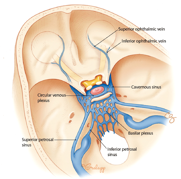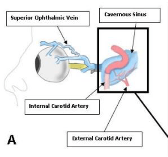 My Endovascular Neurosurgeons & Interventional Neuro-radiologist colleagues usually cure this condition in an elegant way running the angio- catheter through the femoral vein and accessing the CCF through the Inferior Petrosal Vein. Although the inferior petrosal sinus is the simplest, shortest, and most commonly used venous route to the cavernous sinus, the superior ophthalmic vein (SOV), superior petrosal sinus, basilar plexus, and pterygoid plexus present other endovenous options.