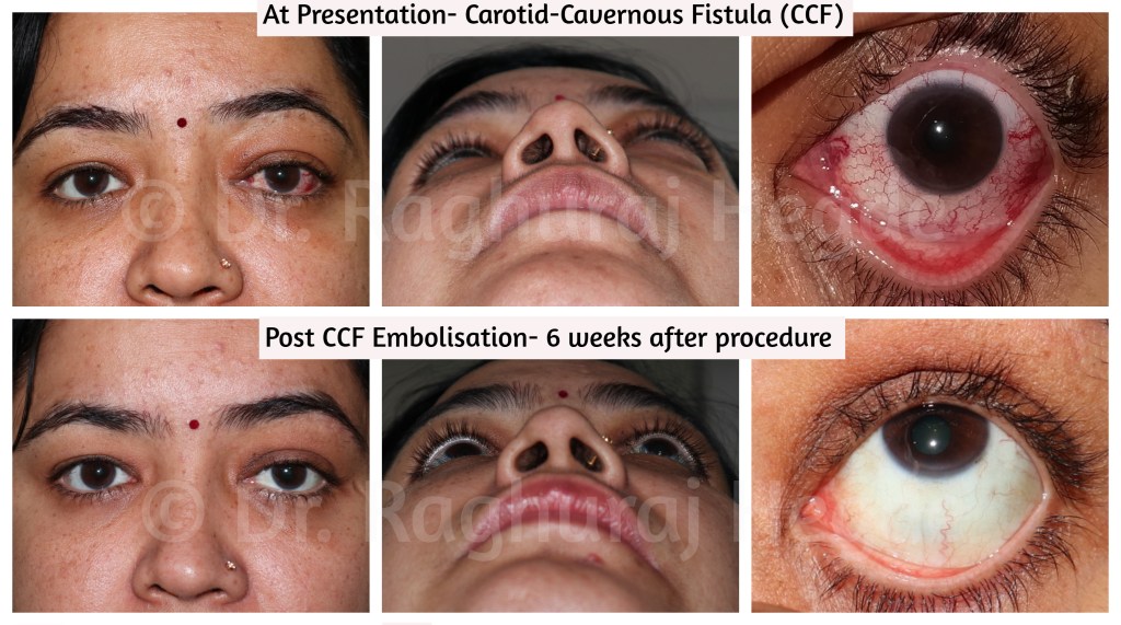 Six weeks post procedure there is complete disappearance of Left Eye Proptosis, Upper eyelid Oedema & engorged episcleral veins. The comparison photos at presentation and 6 weeks post embolisation of CCF.