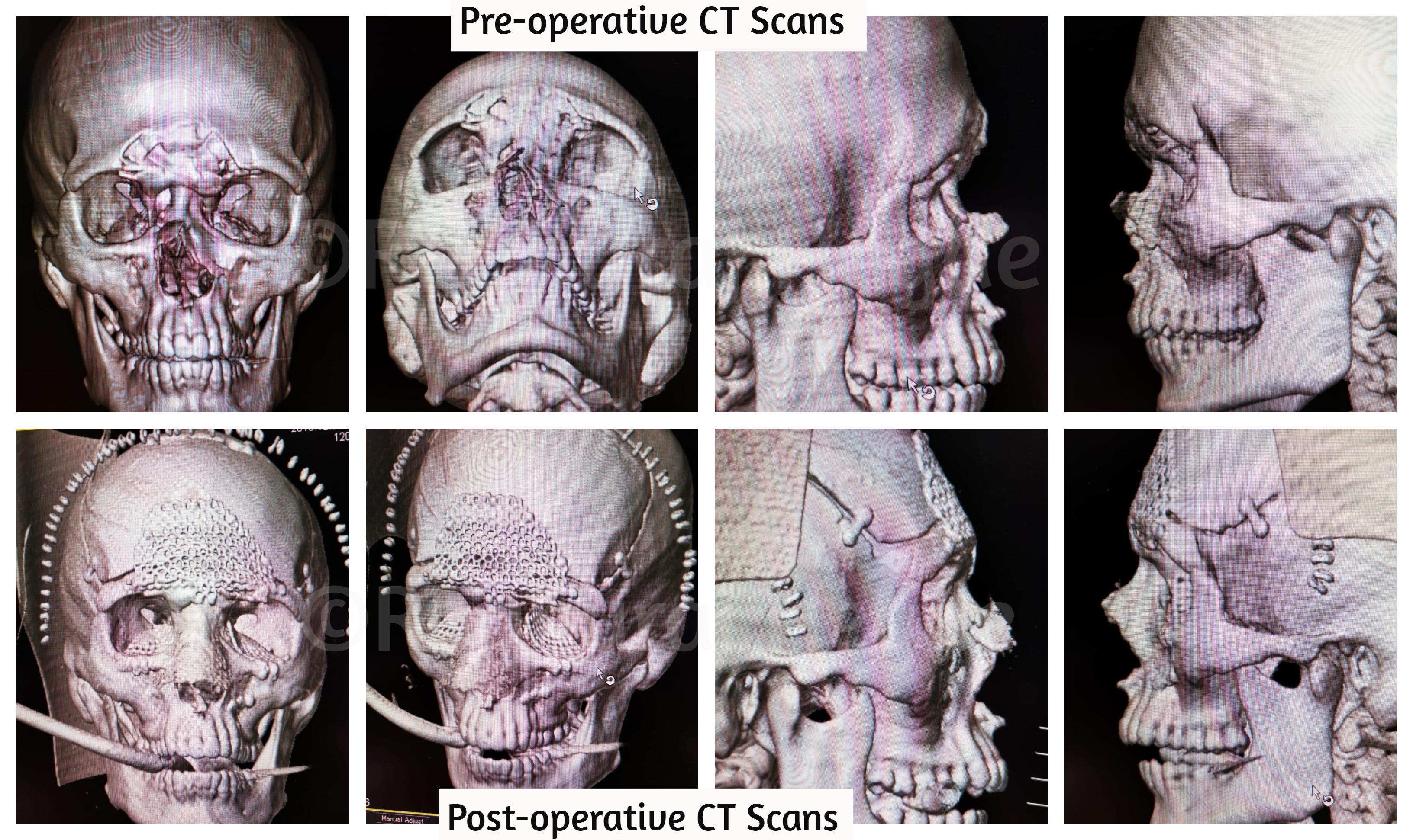(Above) Pre-operative 3D reconstructed CT images showing severe frontal and nasal bone fractures. (Below) Post-operative 3D reconstructed CT images showing well corrected external fractures.