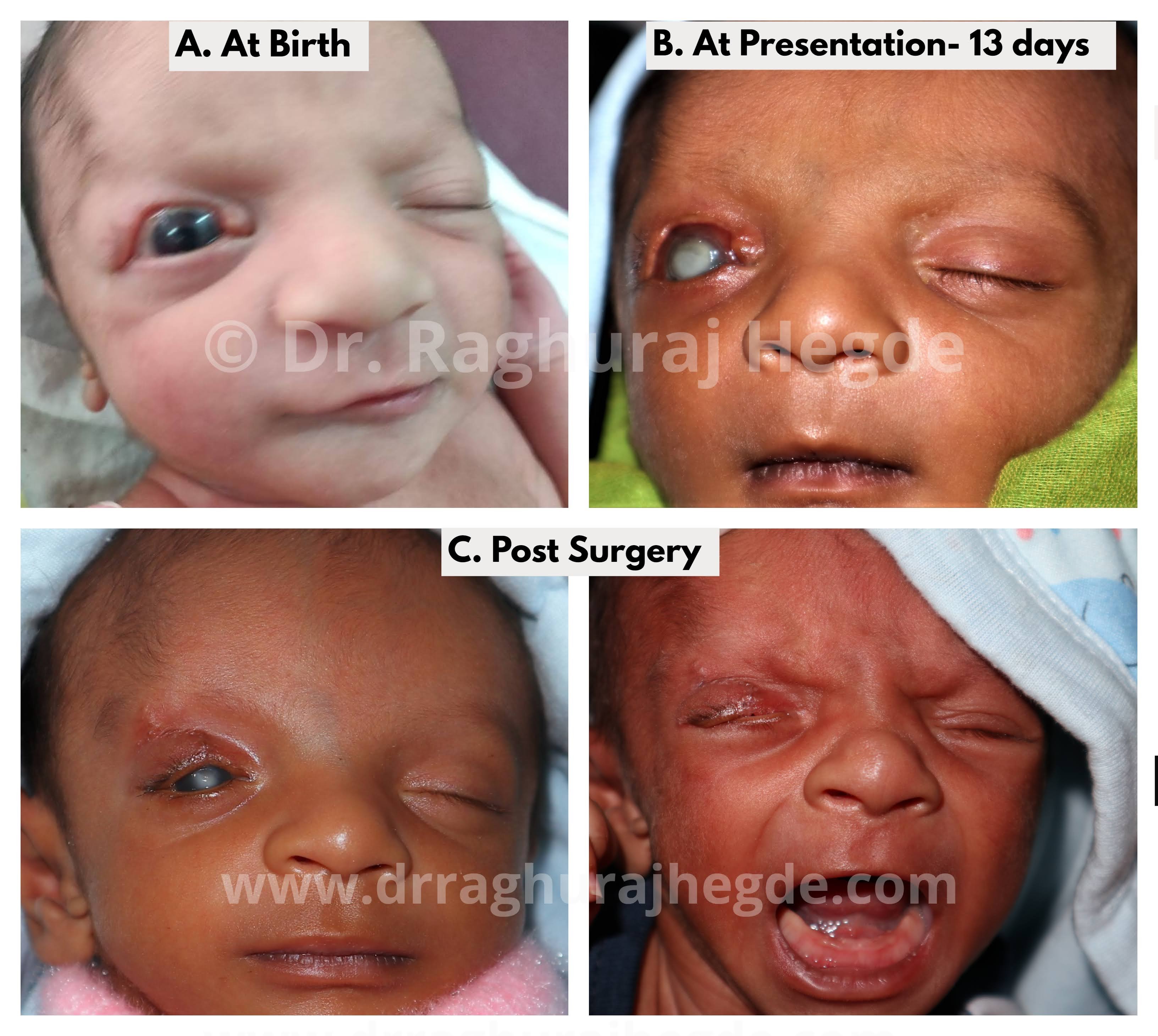Post surgery, with good closure of the eye and with extensive topical antibiotic treatment of the corneal ulcer by our cornea specialist, the corneal abscess started healing, reduced in size and finally became a residual central corneal scar. The baby is awaiting a corneal transplant as soon as we can get a good quality cornea in our eye bank.