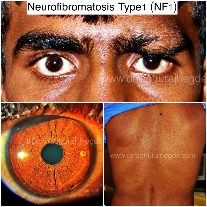 The clincher was by the slit lamp! Lisch Nodules-yellow to brown coloured melanocytic harmartomas- dome shaped projecting out of iris which are harmless and don’t affect vision. However they are present in up to 94% of Neurofibromatosis type 1.