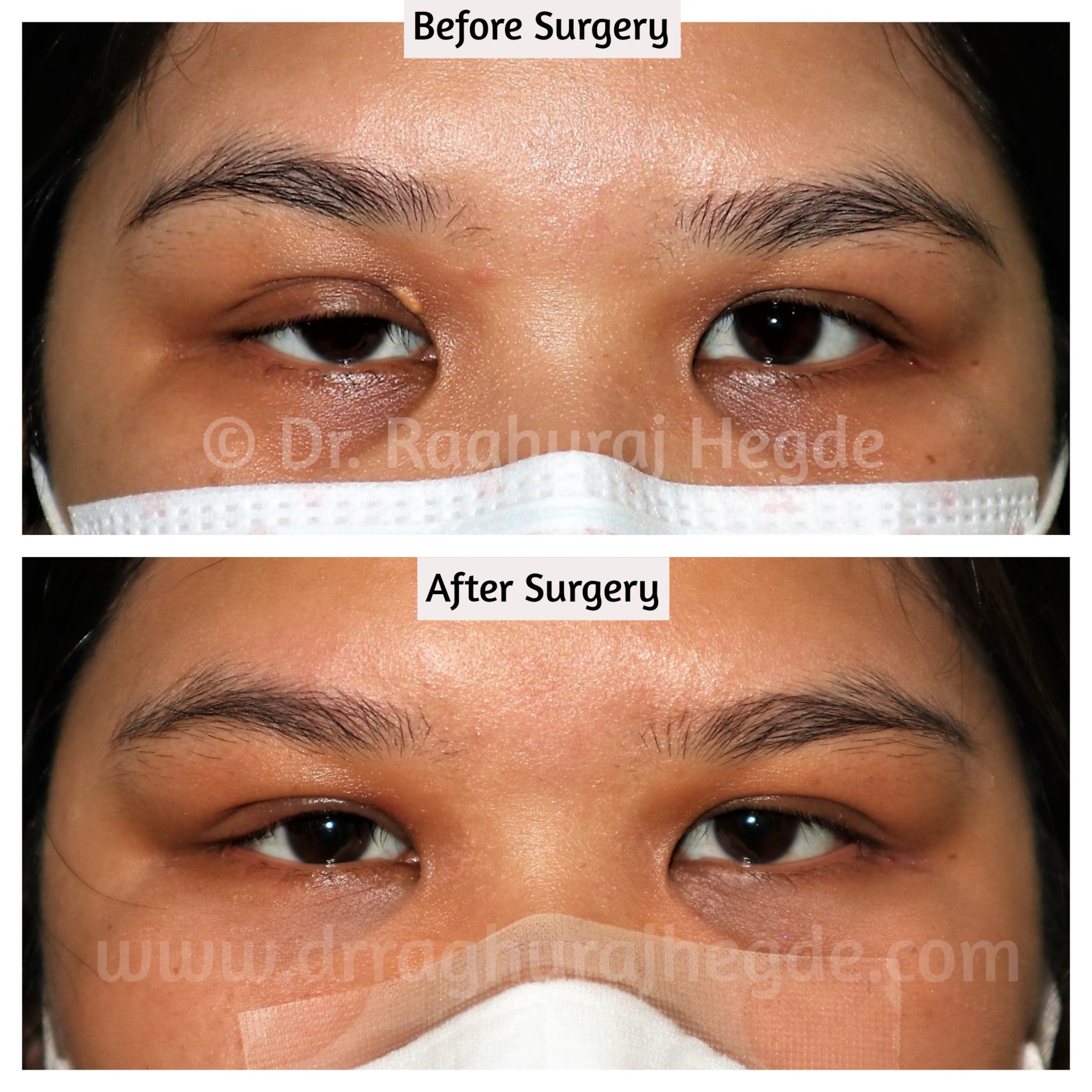 Ptosis can be easily treated with a day care, single sitting surgery and sometimes there need not even be a external skin incision. The surgery is known as conjunctivo-mullerectomy where the ptosis (droopy eyelid) is corrected using an incision on the wet surface of the eyelid.